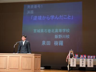 今年度、飯野川校からは泉田樹羅さん(3年次)が出場し、「逆境から学んだこと」という題で発表しました。苦しい状況の中で気づいたこと、逆境を乗り越えたことで見えた将来の夢を力強く発表しました。
